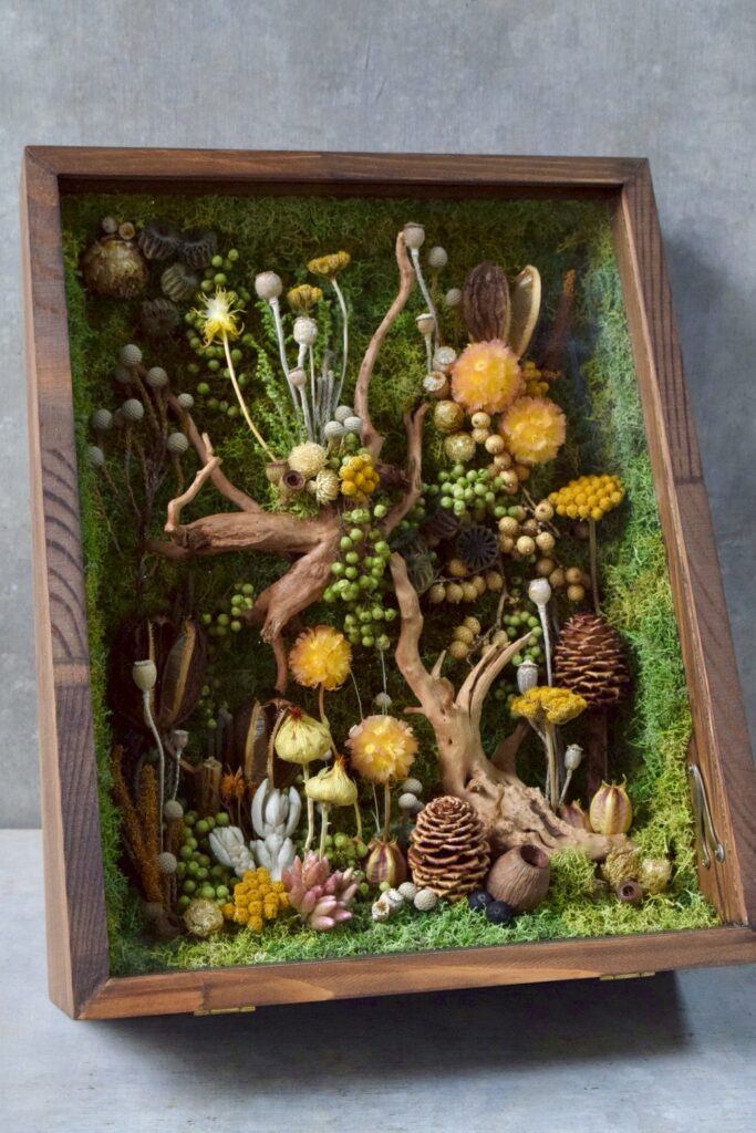 ナチュラルウッドのフレームケースの中で広がる、群生した植物のどこか奇妙で不思議な世界。