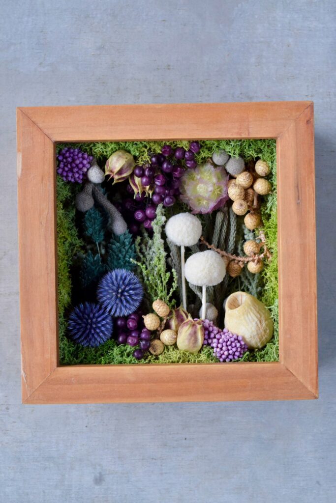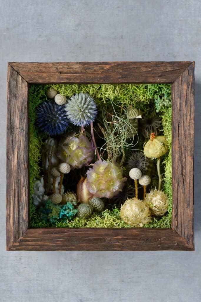 ナチュラルウッドのケースの中はふんわりと苔で覆われ、そこから個性的な植物たちが群生する、どこか奇妙で不思議な植物の世界。