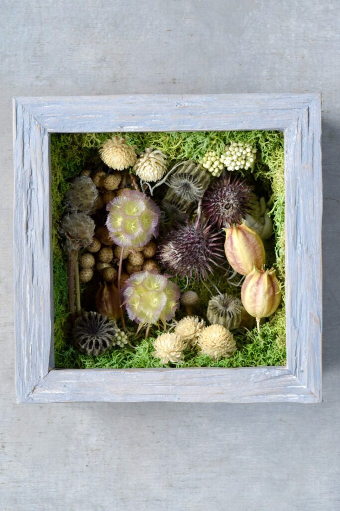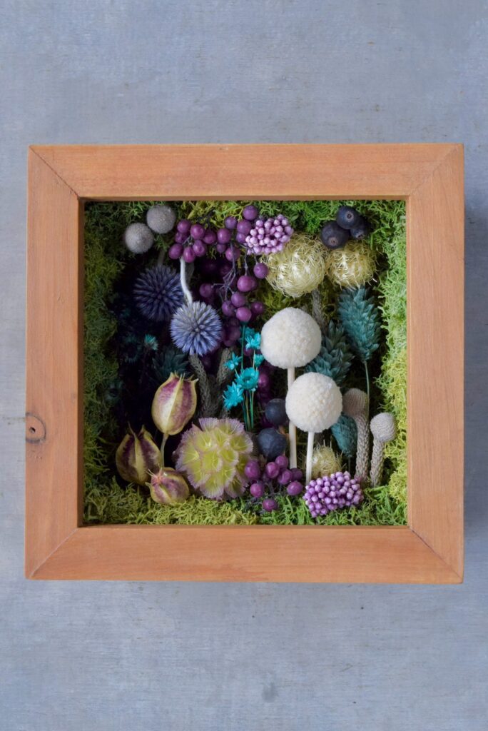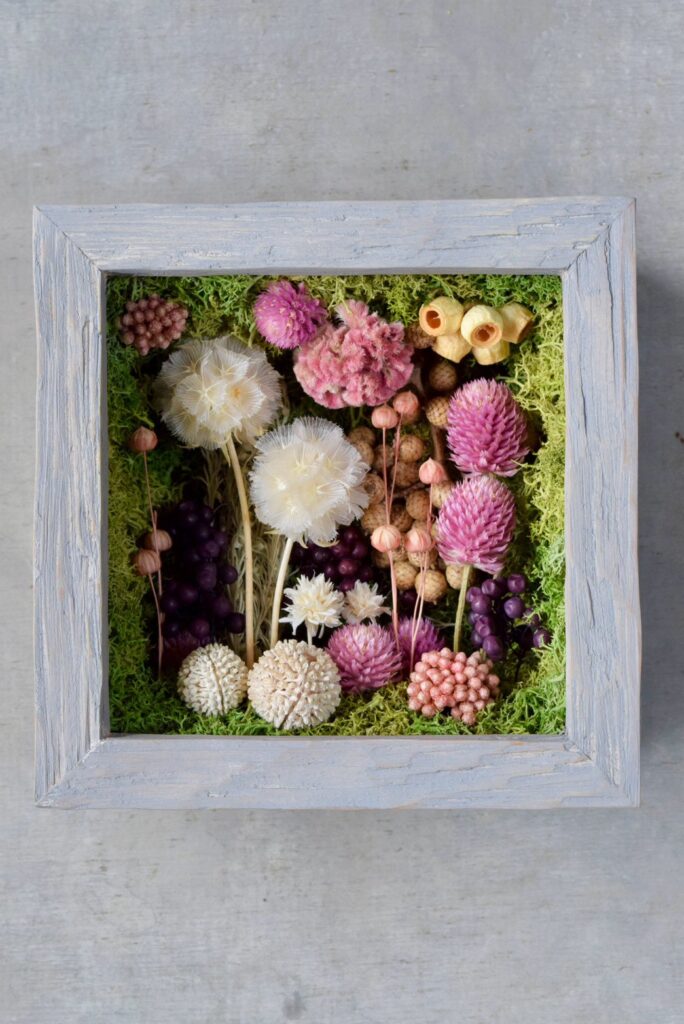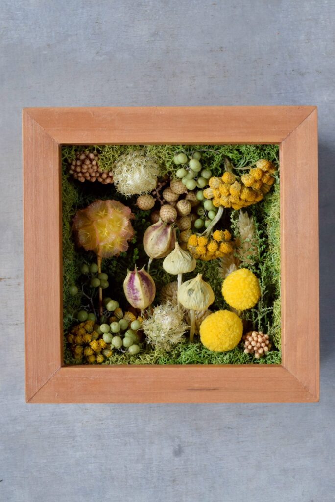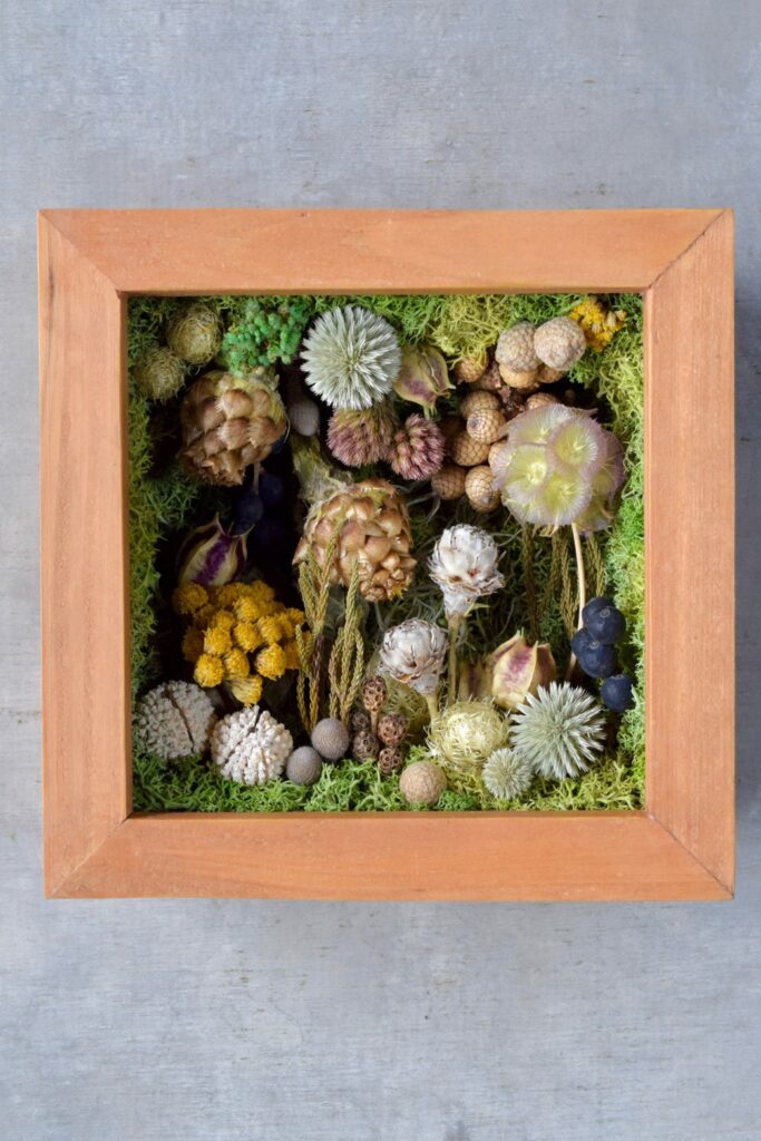 ドライフラワーで埋め尽くされた抽象的なコラージュ絵画のようなスタイルで仕上げた群生小窓。