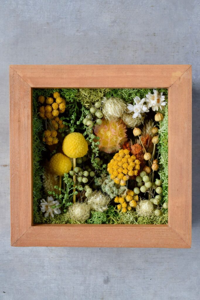 すべて植物素材(ドライフラワー、プリザーブド加工苔)を使用し、一点一点丁寧に制作しています。時間の経過とともに色味が褐色へと変化することがございますが、その移ろいも含めて、ドライフラワーの味わいとしてお楽しみいただければ幸いです。
