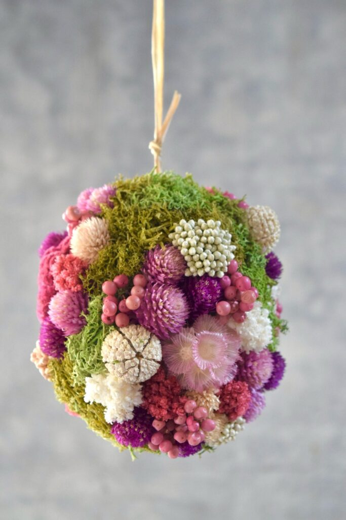 すべて植物素材(ドライフラワー、プリザーブド加工苔)を使用し、一点一点丁寧に制作しています。時間の経過とともに色味が褐色へと変化することがございますが、その移ろいも含めて、ドライフラワーの味わいとしてお楽しみいただければ幸いです。