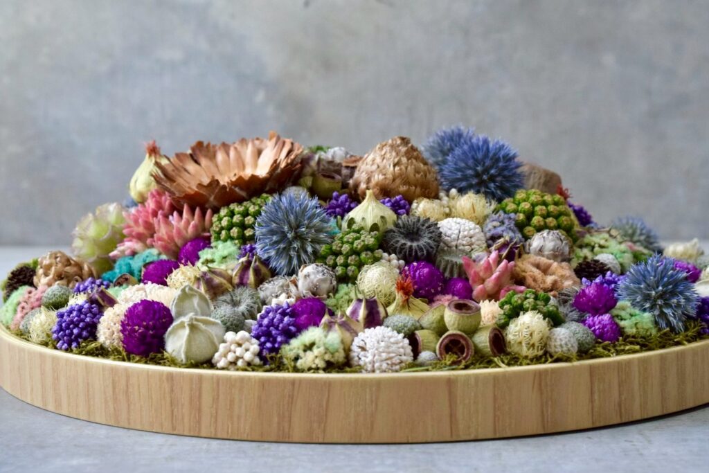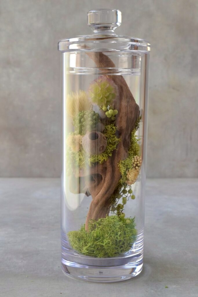 苔が流木を包み込み、植物が自由に伸びる小さな森のようなボタニカルインテリア。