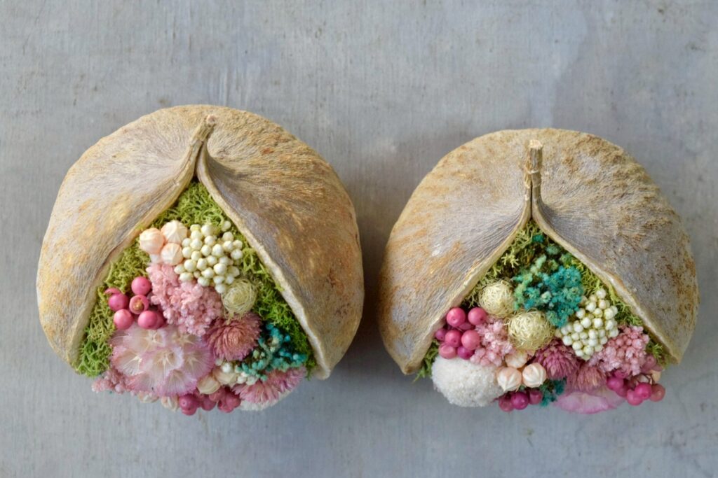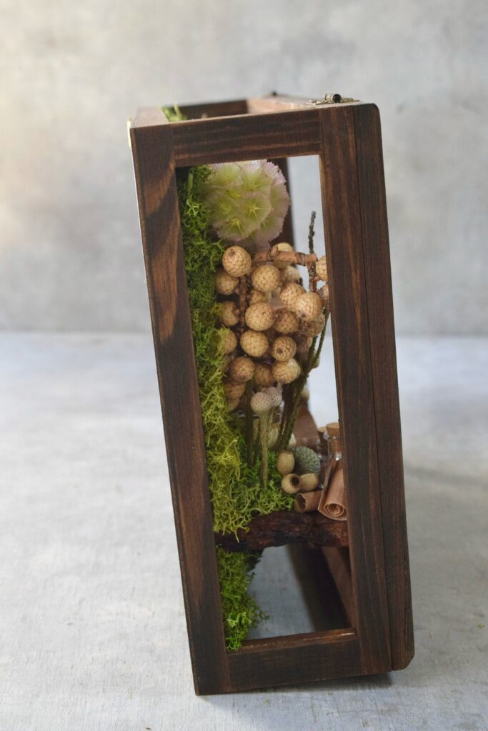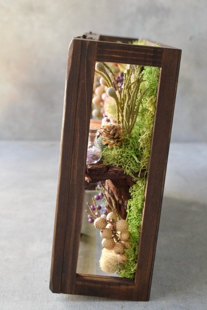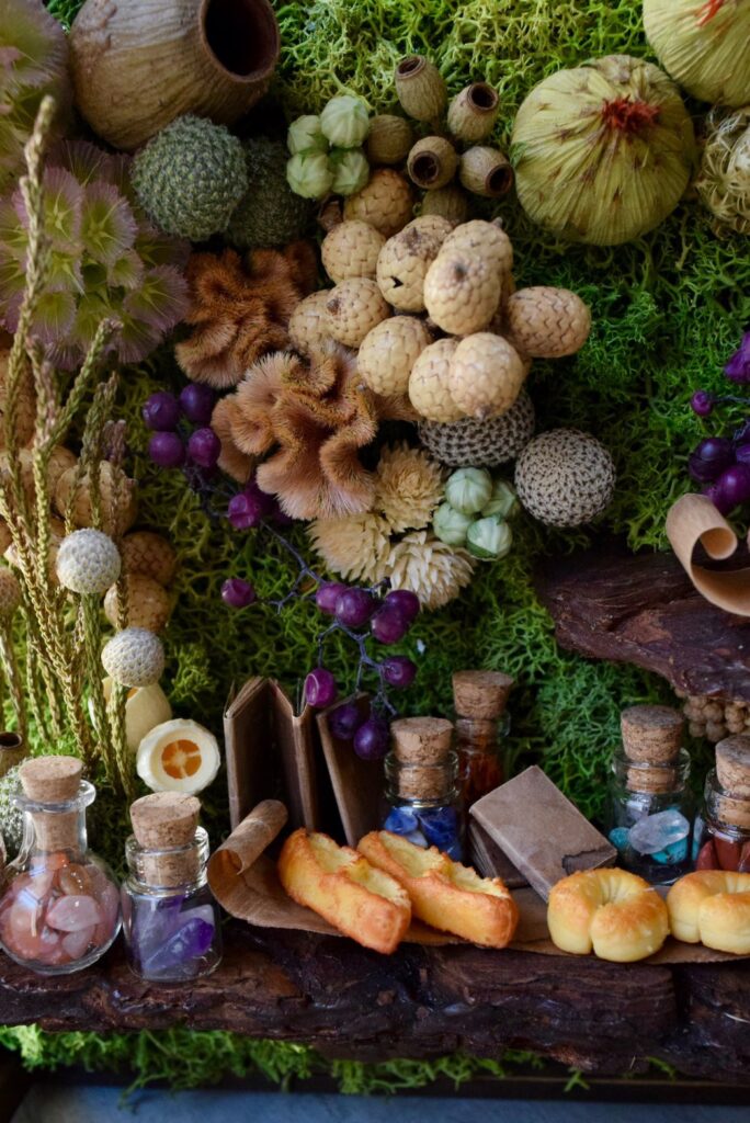 木皮で仕立てた棚に、ミニチュアのパンや鉱物・植物片を詰めた小瓶、古書を収めた木枠の壁掛け装飾。