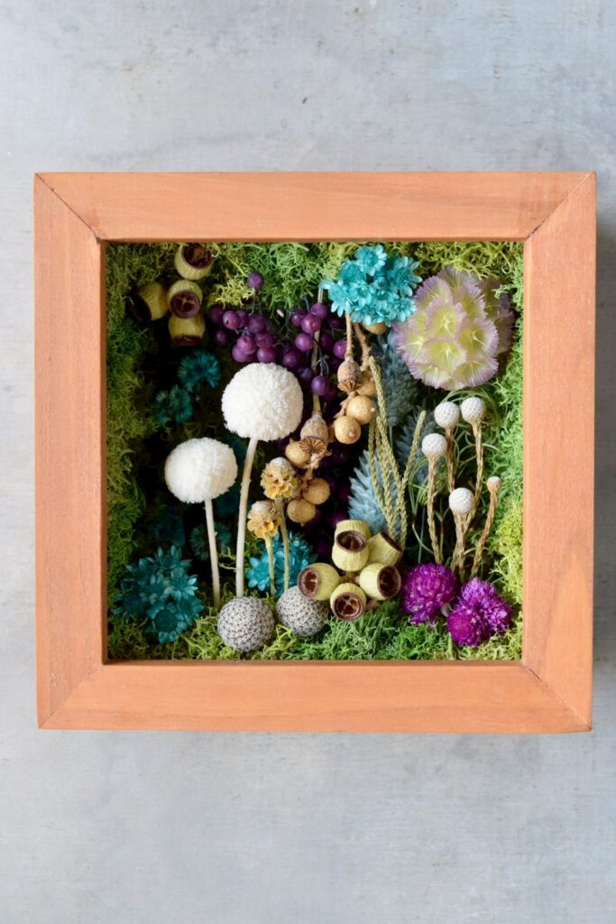 ナチュラルウッドのフレームケース内で広がる、群生した植物が織りなすコラージュ絵画のような「群生地帯」