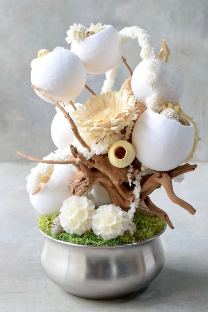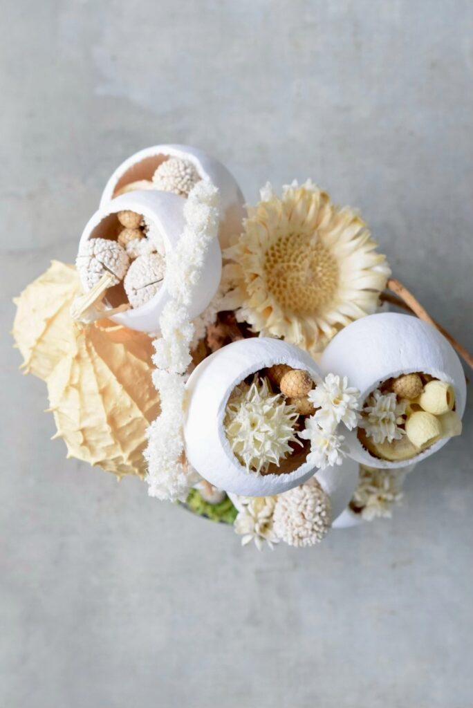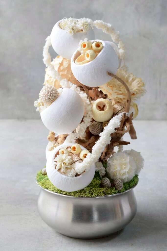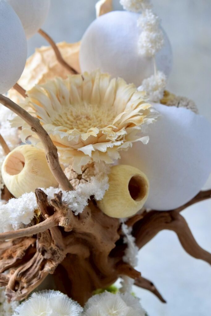 O-14 2026年3月16日 by kusamuraya 白やベージュといった柔らかい印象のドライフラワーでまとめたボタニカルオブジェ。 丸みが特徴的なベルカップの連なりや流木が特徴的な一点です。 高さ28cm×横18cm 配送サイズ80 ¥11,000(税込) オーダーフォーム内の「希望内容」欄は「shopping」を選んでいただき、「shopping内商品番号」欄に「O-14」とご記入ください。 カートに追加 ※カートに入れた商品は自動でオーダーフォーム内に記入されます。記入された番号は手動での訂正が可能です。 オーダーフォーム