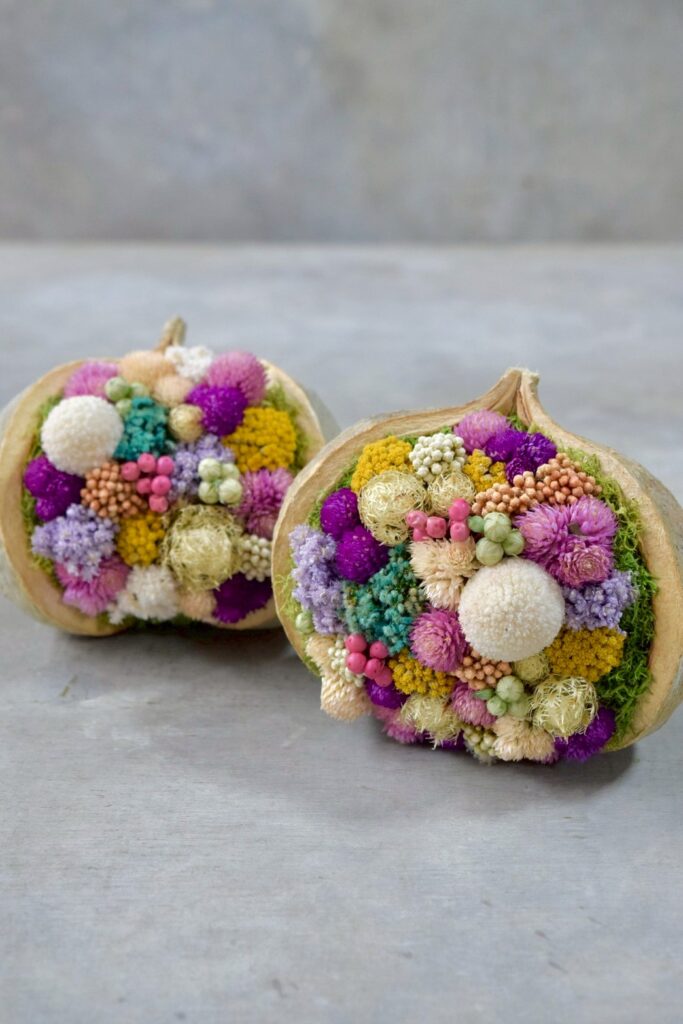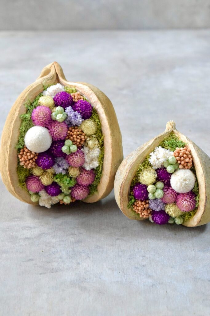 幸福をもたらすと言われる縁起物のブッダナッツを器にしたドライフラワーアレンジ。
