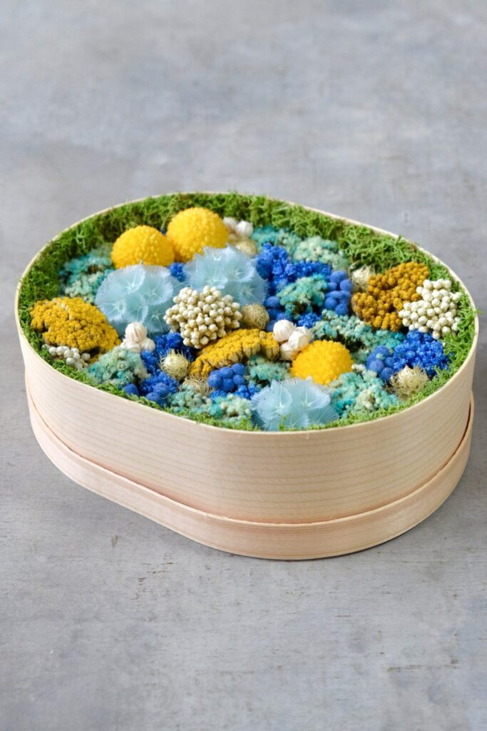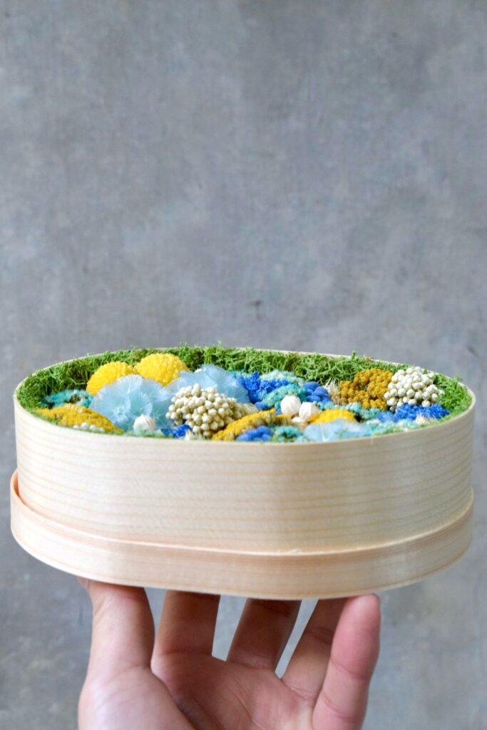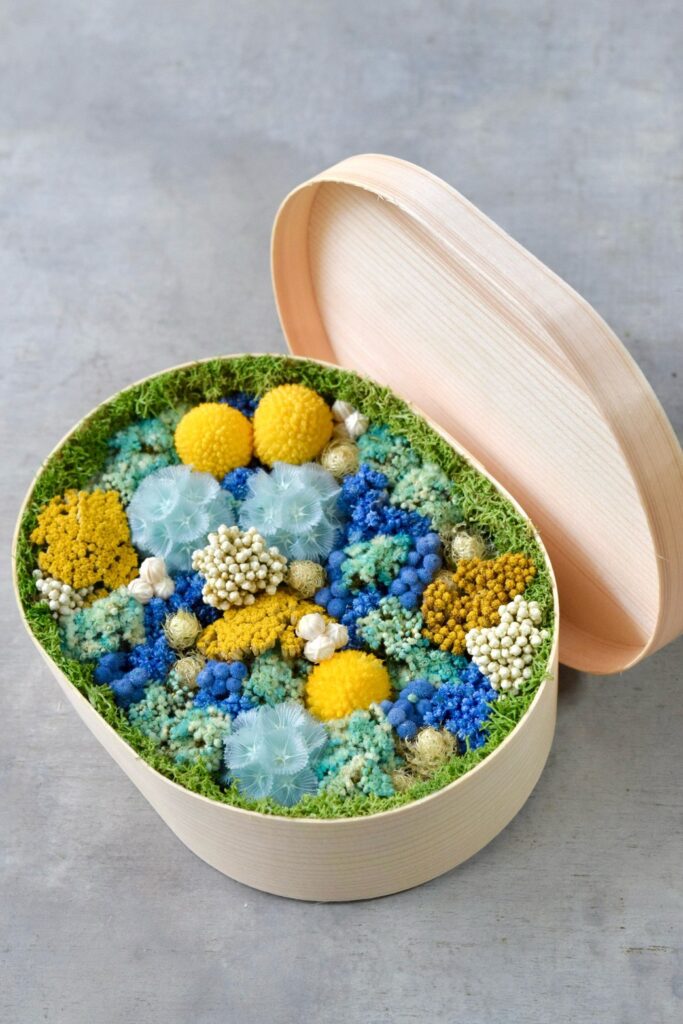 わっぱ弁当箱の中に小さな花々をぎゅっと詰め込んだ華やかなお弁当箱アレンジ。