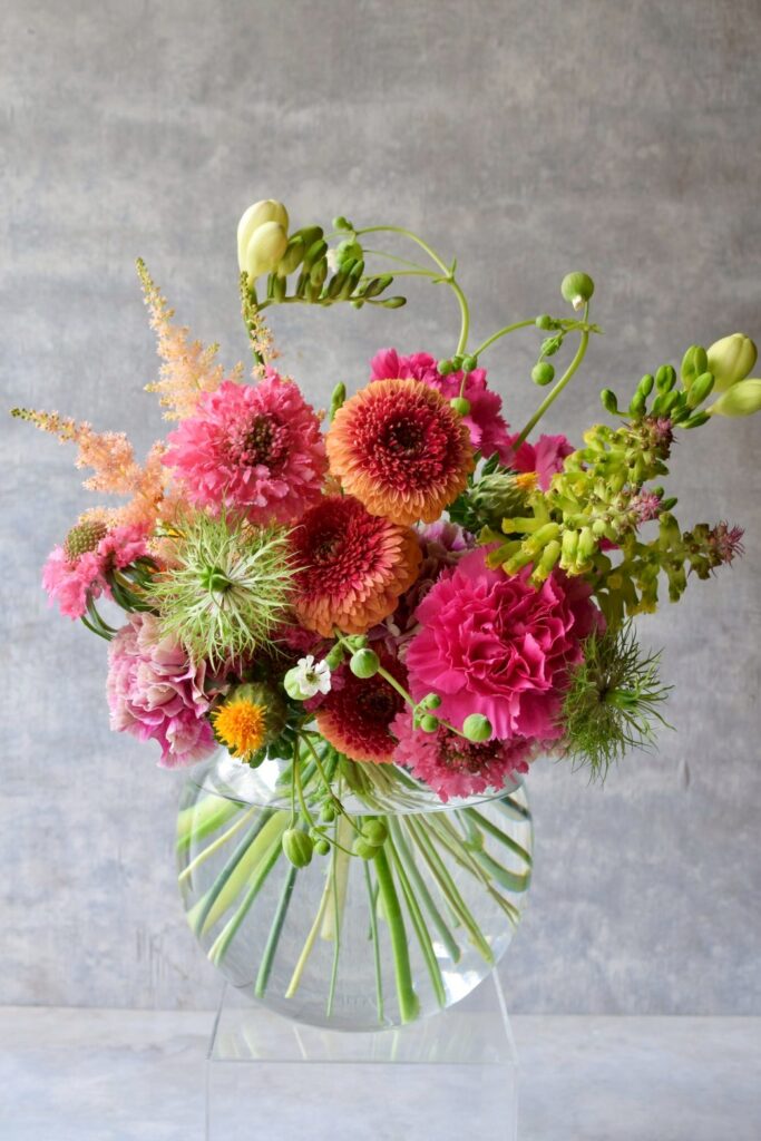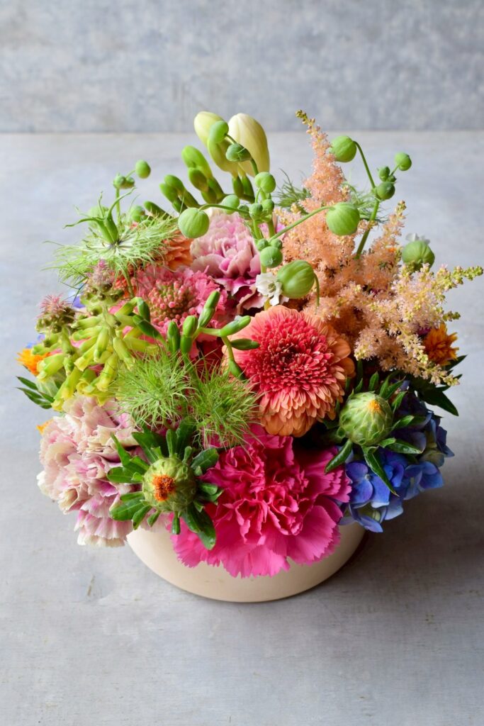 アイボリーの器に色とりどりのお花をラウンド状にアレンジした一点です。