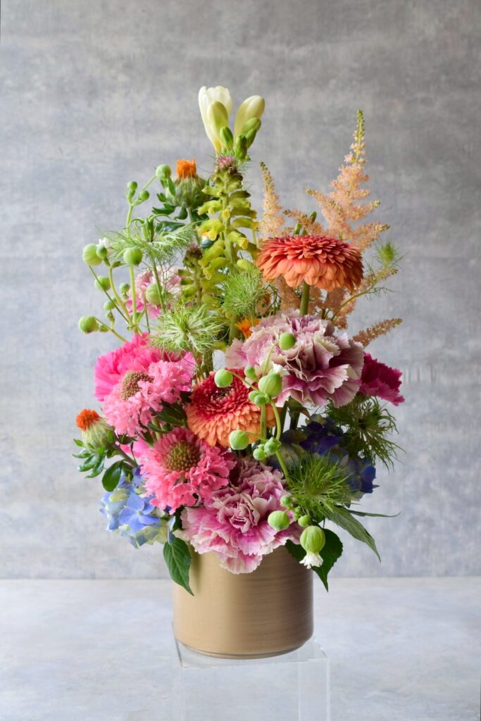 ゴールドのステンレス花器を使用した、ボリュームの良さを感じられるアレンジメントです。